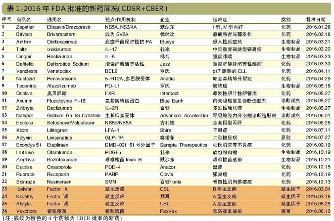 从治疗领域来看,2016年FDA批准新药包括: