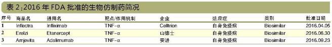 2016年,FDA共批准了3个生物类似药:Celltrion的Inflectra(参照药为Remicade)、山德士的Erelzi(参照药为Enbrel)和安进的Amjevita(参照药为Humira)。