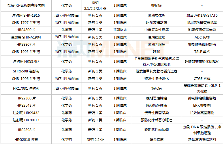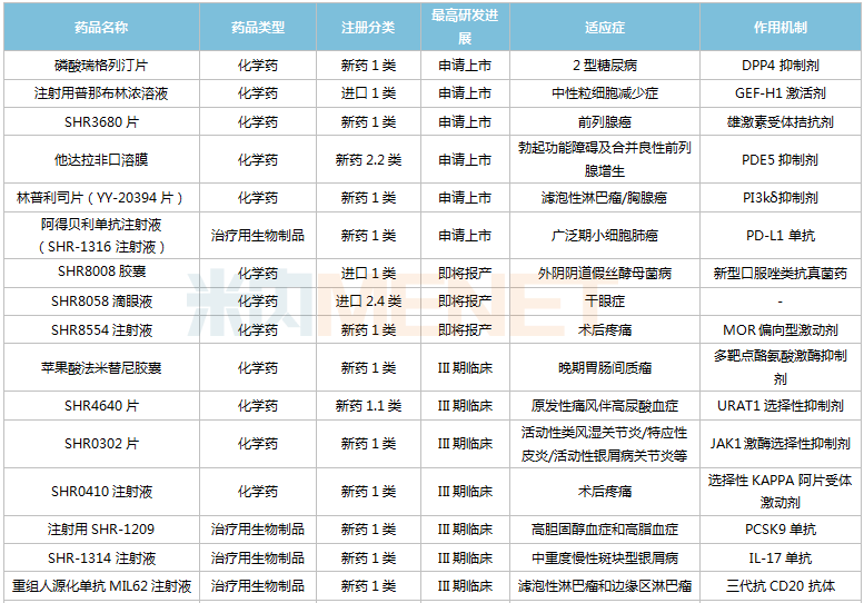 从研发进展看,9款新药已/即将申报上市(最高研发进展,下同),除了他达拉非口溶膜及SHR8058滴眼液,其余7款均为1类新药;13款新药步入III期(含II/III期)关键临床,其中9款为1类新药。