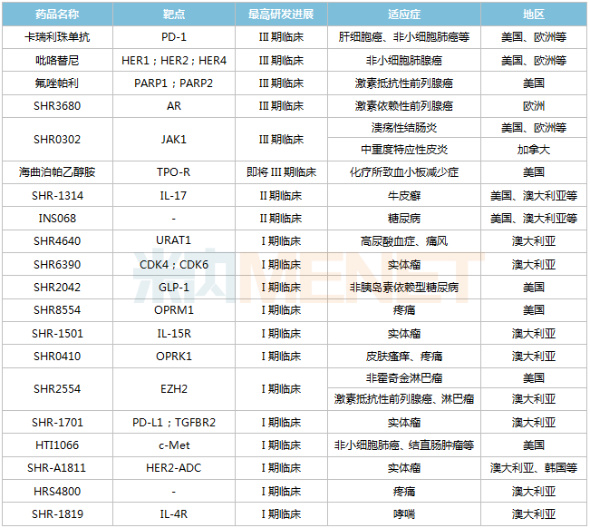 恒瑞医药部分在海外开展临床的创新药