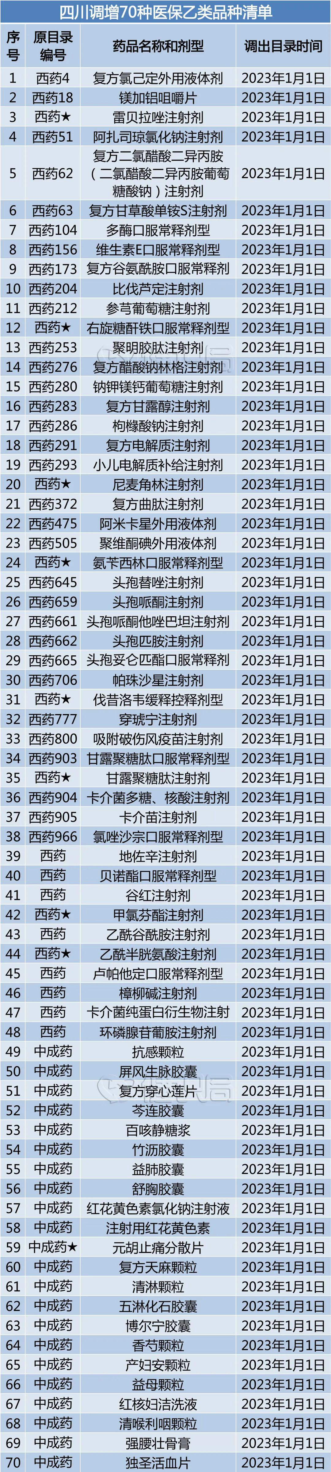 四川70个调出医保的名单里,共有48个西药、22个中药,其中不乏地高辛注射剂、谷红注射剂、雷贝拉唑注射剂、比伐卢定注射剂、抗感颗粒以及清喉利咽颗粒等知名大品种。