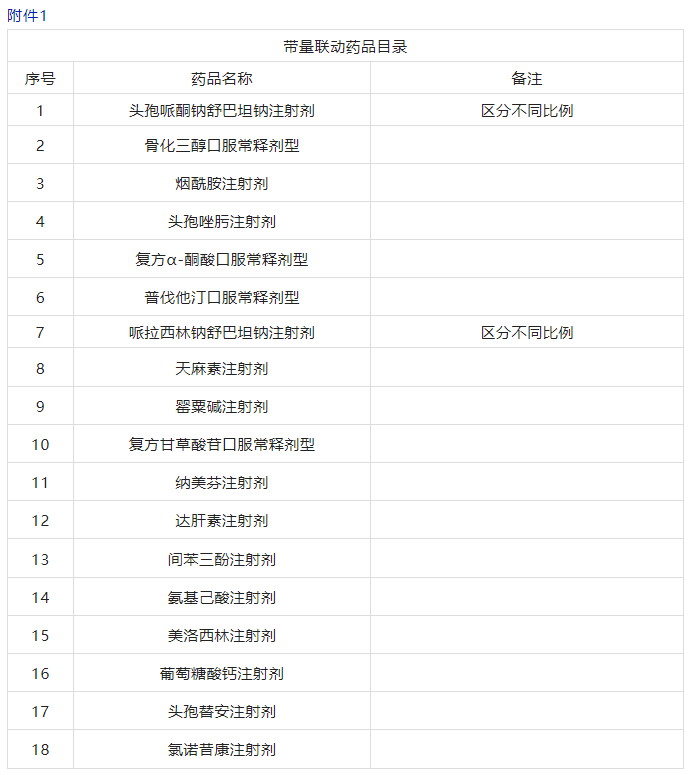 带量联动药品18种(其中,头孢哌酮舒巴坦和哌拉西林舒巴坦区分不同比例分别报量),原则上以预采购量80%作为中选药品的约定采购量