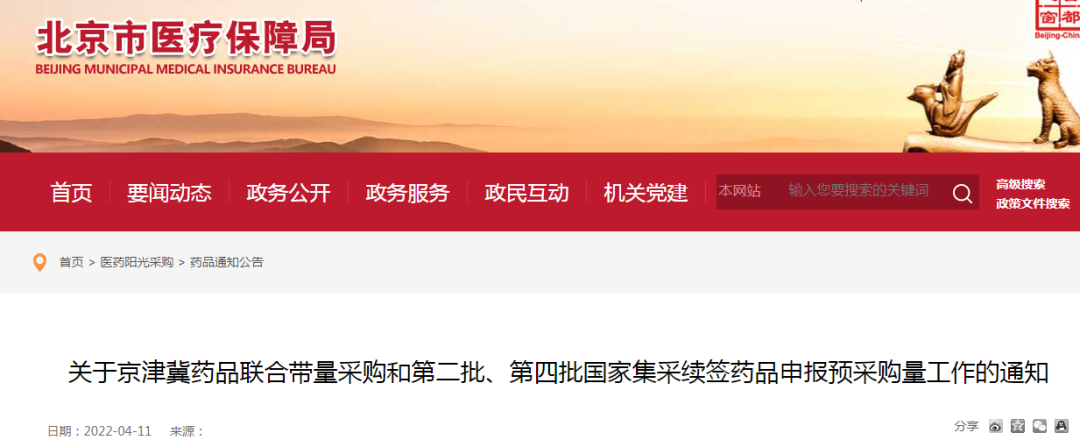 本日,北京市医药集中采购服务中心发布《关于京津冀药品联合带量采购和第二批、第四批国家集采续签药品申报预采购量工作的通知》,填报时间为2022年4月12日9时至4月19日17时。医疗机构应从京津冀联合带量采购29个药品候选产品中遴选所需药品,并填报未来一年预采购量,其中: