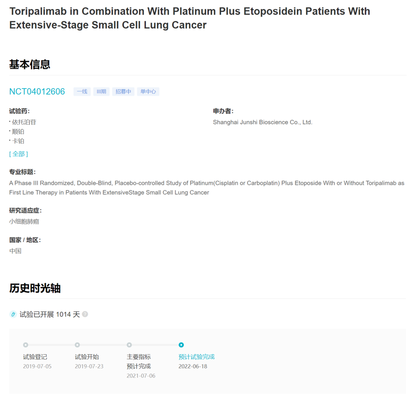 目前,君实生物正在开展一项针对小细胞肺癌的注册临床研究——JUPITER-08 研究(NCT04012606),并已完成受试者入组。JUPITER-08 是一项随机、双盲、安慰剂对照、多中心的 III 期研究,旨在评估特瑞普利单抗联合依托泊苷及铂类与安慰剂联合依托泊苷及铂类在一线治疗广泛期小细胞肺癌中的有效性和安全性。