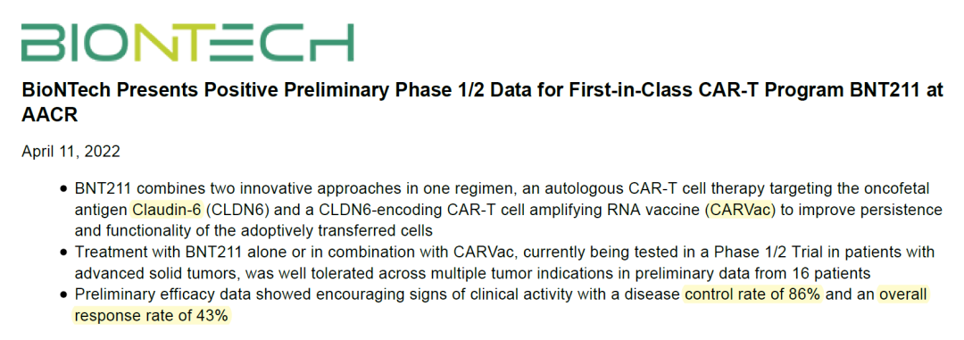 2022年4月10日,BioNTech 在美国癌症研究协会(AACR)2022 年会上公布了其CAR-T+CARVac联合治疗 Claudin6(CLDN6)阳性实体瘤(睾丸癌、卵巢癌等)的1/2期临床初步数据,显示出良好的安全性和令人鼓舞的初步治疗效果。