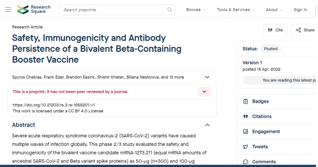 回到这篇论文,已在预印本上发表,文章题为Safety, Immunogenicity and Antibody Persistence of a Bivalent Beta-Containing Booster Vaccine。