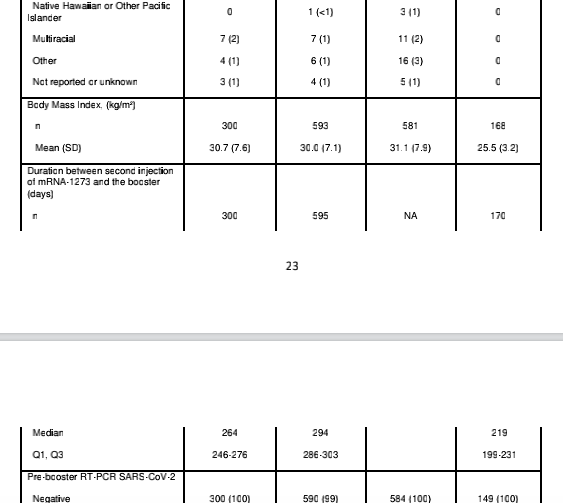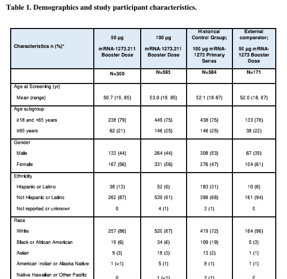 在该临床研究中,受试者为895名,均为18岁以上,分布于美国9个临床中心,均已在至少6个月前接种完标准的两剂mRNA1273疫苗。 加强针受试者接种的都是mRNA-1273.211疫苗,其中300人接种了50µg剂量,其余595人接种的是100µg剂量。 下表为参与该临床研究的人员分布详情。