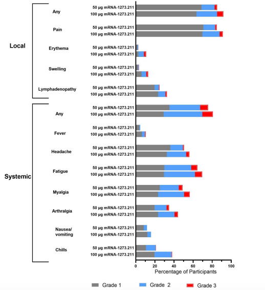 在接受50 µg二价疫苗的参与者中,大多数人的不良反应是轻微的。接受100 µg二价疫苗的参与者中,大多数人的不良反应是轻微或中度的。 总体而言,50 µg剂量的mRNA-1273.211与mRNA-1273初级系列的反应原性特征相当,而100 µg剂量的mRNA-1273.211局部和全身不良反应的发生率更高。