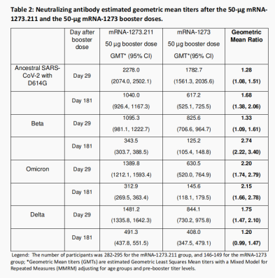 在接种50 µg mRNA-1273.211和50 µg mRNA-1273加强针后,中和抗体几何平均滴度