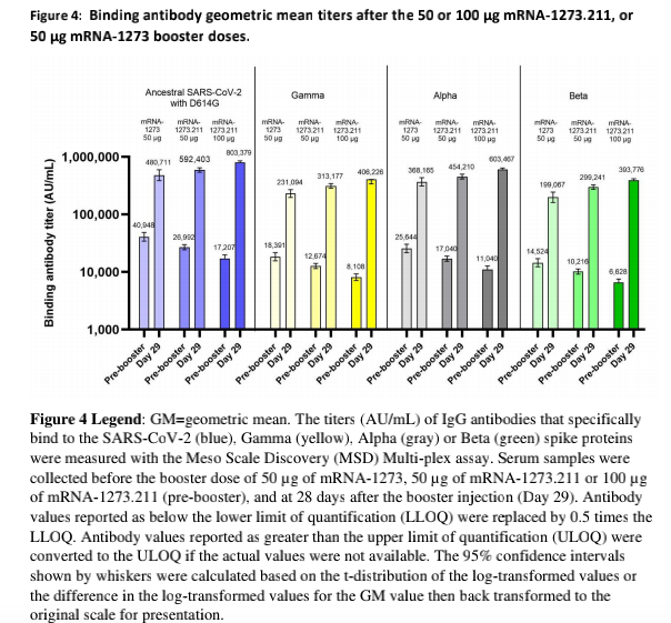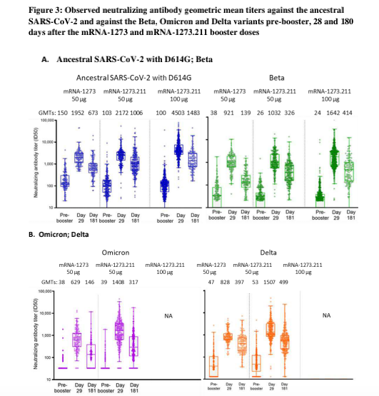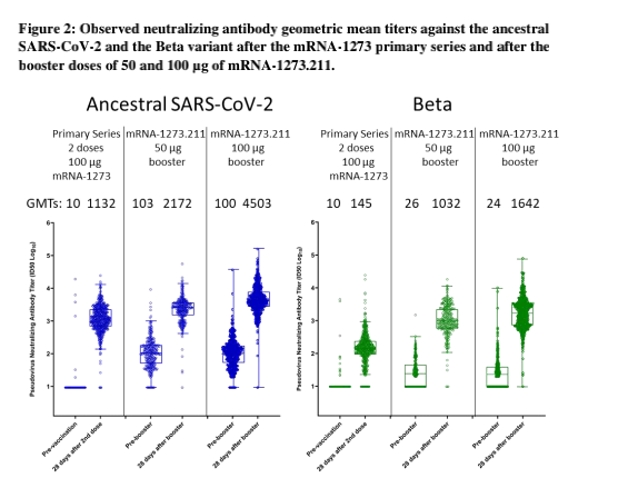 最后,我们再附上针对不同毒株,50 µg以及100 µg的mRNA-1273.211疫苗,或50µgmRNA-1273加强针的抗体产生情况。(见下图)