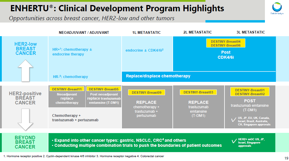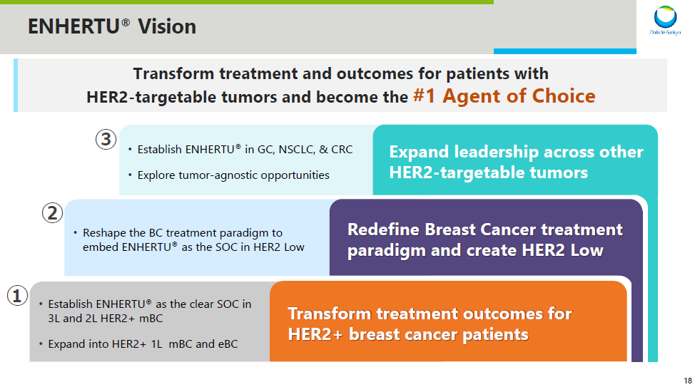 DESTINY-Breast04 研究的突破,有望助推阿斯利康和第一三共利用领先 ADC 药物覆盖乳腺癌治疗的全领域,包括在不同 HER2 表达状态和不同 HR 表达状态中的探索。同时在广覆盖之余,第一三共和阿斯利康还在推进这些疗法向更前线开发(详见下图)。在乳腺癌之后,还将探索 Enhertu 在胃癌(GC)、非小细胞肺癌(NSCLC)、结直肠癌(CRC)中的疗效(PPT 资料来自第一三共,可在公众号中回复「第一三共 2021」下载)。