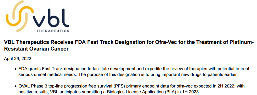 4月26日,VBL Therapeutics宣布,美国FDA授予ofra-vec (ofranergene obadenovec,VB-111)快速通道资格,联合紫杉醇治疗铂耐药卵巢癌。