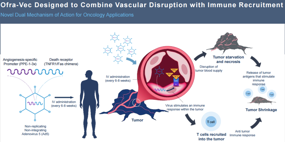 该载体是一种非复制型5型腺病毒载体,可将启动子和转基因分布到全身;启动子PPE-1-3X是一种修饰的鼠前内皮素1,对其进行基因修饰,仅在滋养肿瘤血管中诱导转基因表达。该转基因是一种FAS-TNF受体1嵌合基因,其表达的蛋白可诱导肿瘤血管内皮细胞凋亡。VB-111的抗血管生成作用预期可触发肿瘤饥饿和肿瘤细胞破坏。抗原递呈细胞摄入的细胞碎片和肿瘤新抗原的后续释放可进一步刺激抗肿瘤免疫应答。