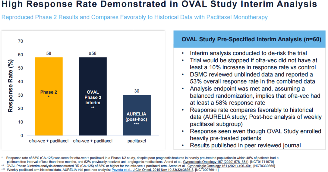 VBL公司目前正在开展VB-111联合紫杉醇治疗铂耐药卵巢癌的III期OVAL研究。此前公布的中期分析结果显示,60名可评估疗效患者的CA-125(一种肿瘤标志物)总体反应率为53%。在随机分组平衡的情况下,这种联合疗法(VB-111联合紫杉醇)的反应率可达到58%或更高。