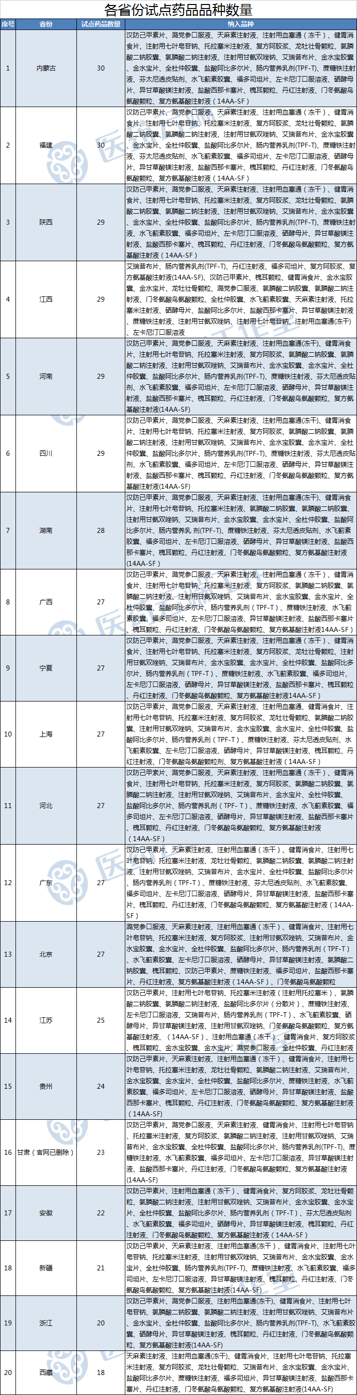 根据医药云端工作室统计,截止目前,已经有20个省市公布了试点品种和医保支付标准(福建仅公布品种清单),其中甘肃省为最早公示试点品种的省份,不过后面官网将其删除,具体原因不明。