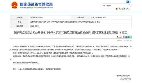 5月9日,国家药监局发布《中华人民共和国药品管理法实施条例(修订草案征求意见稿)》(以下简称《意见》),向社会公开征求意见。