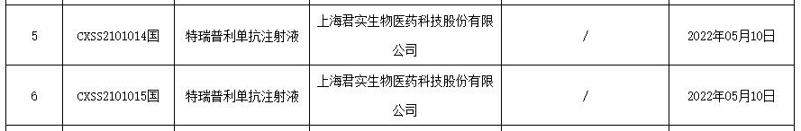 5 月 13 日,NMPA 最新批件显示,君实的特瑞普利单抗第 5 项适应症获批上市,联合紫杉醇/顺铂一线治疗晚期或转移性食管鳞癌。