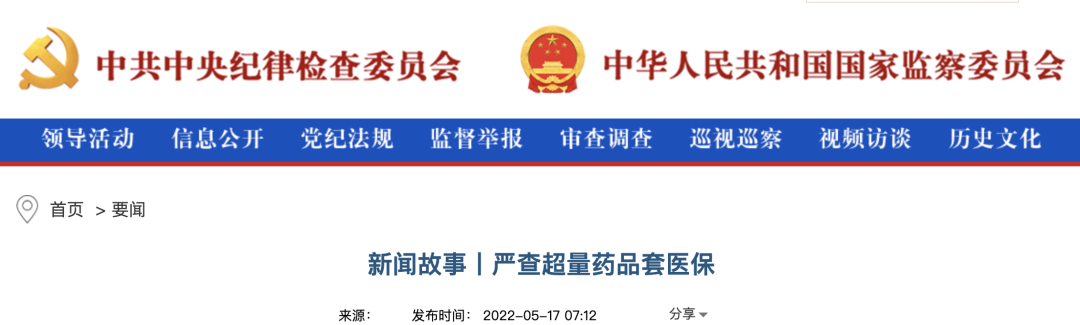 5月17日,中共中央纪律检查委员会官方网站发布《新闻故事|严查超量药品套医保》,文章内容显示,通过调取药品“进销存”台账与医保刷卡记录数据,发现部分医务人员违规套取医保基金的行为,作为典型案件予以曝光。