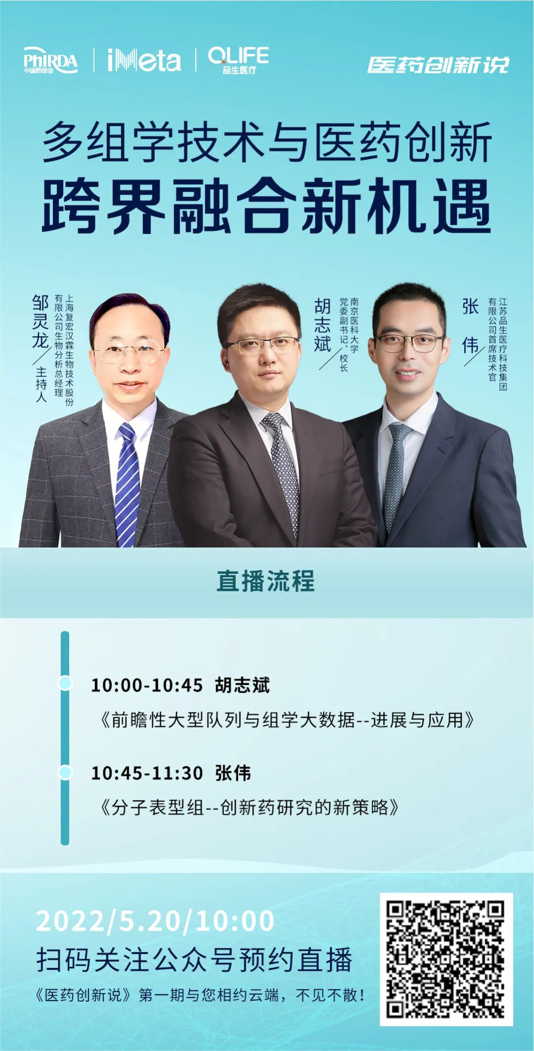 本期“医药创新说”由中国医药创新促进会医药数字化及创新疗法专委会(筹)主办,将围绕多组学技术及其应用展开探讨,特别邀请到南京医科大学党委副书记、校长胡志斌以及江苏品生医疗科技集团有限公司首席技术官张伟担任主讲嘉宾,由上海复宏汉霖生物技术股份有限公司生物分析总经理邹灵龙主持。