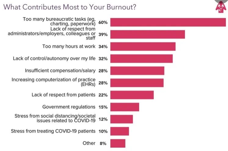 2018 年,丁香园曾做过一篇有关职业倦怠的文章,细数其影响因素:工作负荷、职业环境、收入、文书负担等等。Medcape 2022 年的报告也列出了最新的影响因素排名,其中,过多的行政工作(例如文书)占据 60%,占据第一名。其次为未得到同僚信任、过劳。