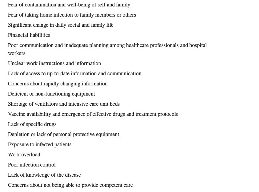 在新冠背后,诸多因素正在困扰着医护人员。Int Orthop 列举「害怕自己感染」「害怕传染给家人」「担心防护用品不足」「担心患者死去」「工作时间过长」等等。