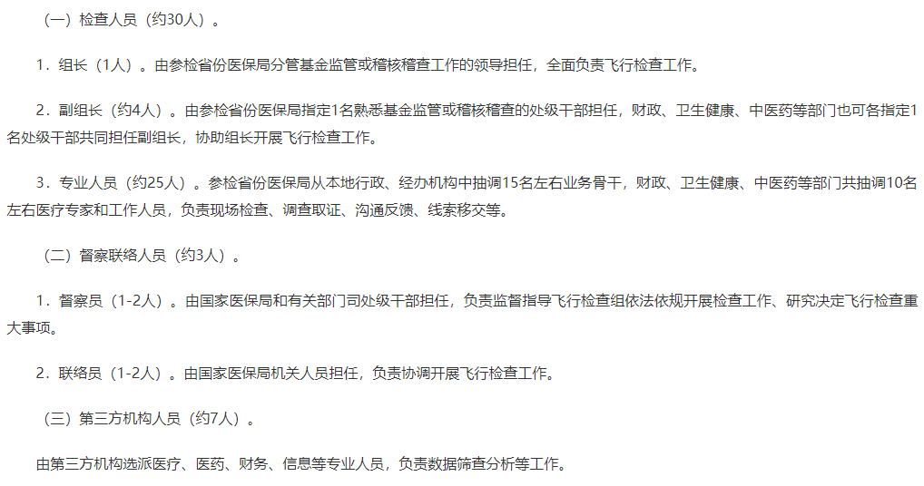 《工作方案》明确了飞检组的人员组成,要求由国家医保局会同财政部、国家卫生健康委、国家中医药局等部门组成若干飞行检查组联合开展飞行检查,实行组长负责制,每组人数控制在40人以内。