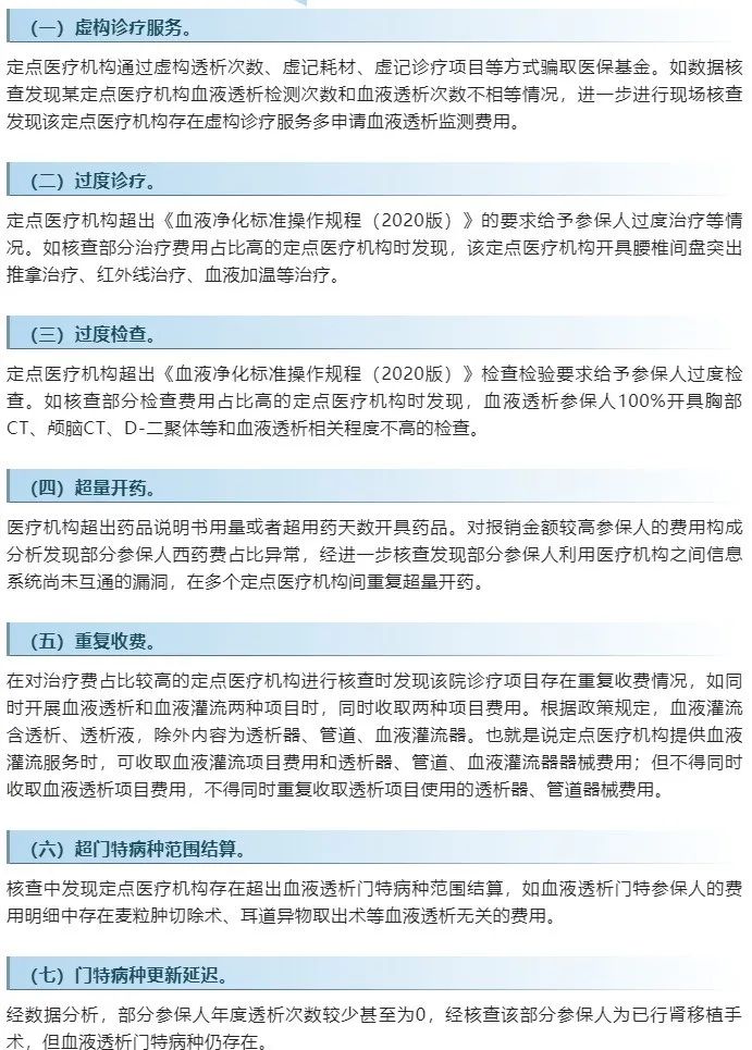 佛山市禅城区社会保险基金管理局梁宜钢针对血透骗保问题总结过7种违规行为(见下图),给出较有参照性的具体检查方法,已发表在“中国医疗保险”微信公众号中,可点击链接查看:《血透机构欺诈骗保行为盘点》。