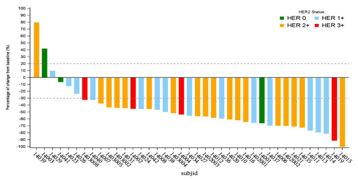 截至2022年4月22日,39例至少有两次肿瘤评估的患者中,cORR为71.8% (95%CI: 55.1, 85),包括3例CR(7.7%),25例PR(64.1%);DCR为92.3% (95%CI: 79.1, 98.4)。一线cORR 为73.9%,六个亚组HER2 IHC(2 + /3 +) PD-L1 (+),HER2 IHC (2 + /3 +) PD-L1 (-), HER2 IHC (1+) PD-L1 (+),HER2 IHC (1+)PD-L1 (-),HER2 IHC (0) PD-L1 (+), HER2 IHC (0) PD-L1(-)的cORR分别为85.7%,86.7%,50%,60%,0%和50%。mPFS 为 9.2 个月,mOS未达到。