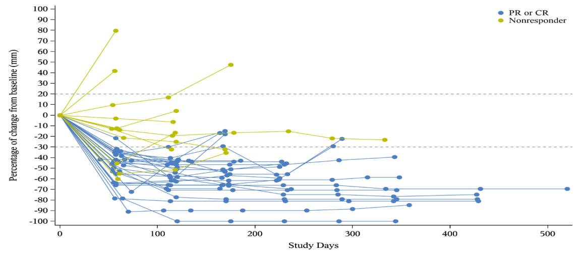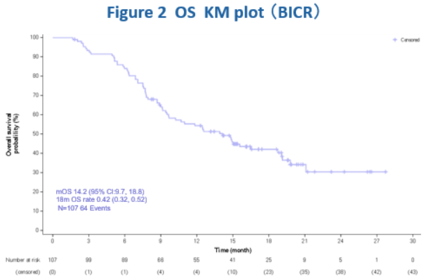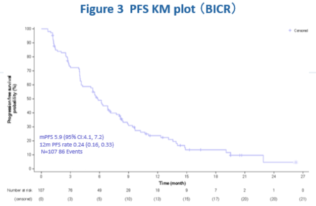 107名受试者的平均OS随访时间为19.1个月。在这两项临床试验中,中位OS均超过1年,在当前的汇总分析中,mOS为14.2个月,持续延长。mPFS为5.9个月(95%CI:4.1,7.2)。