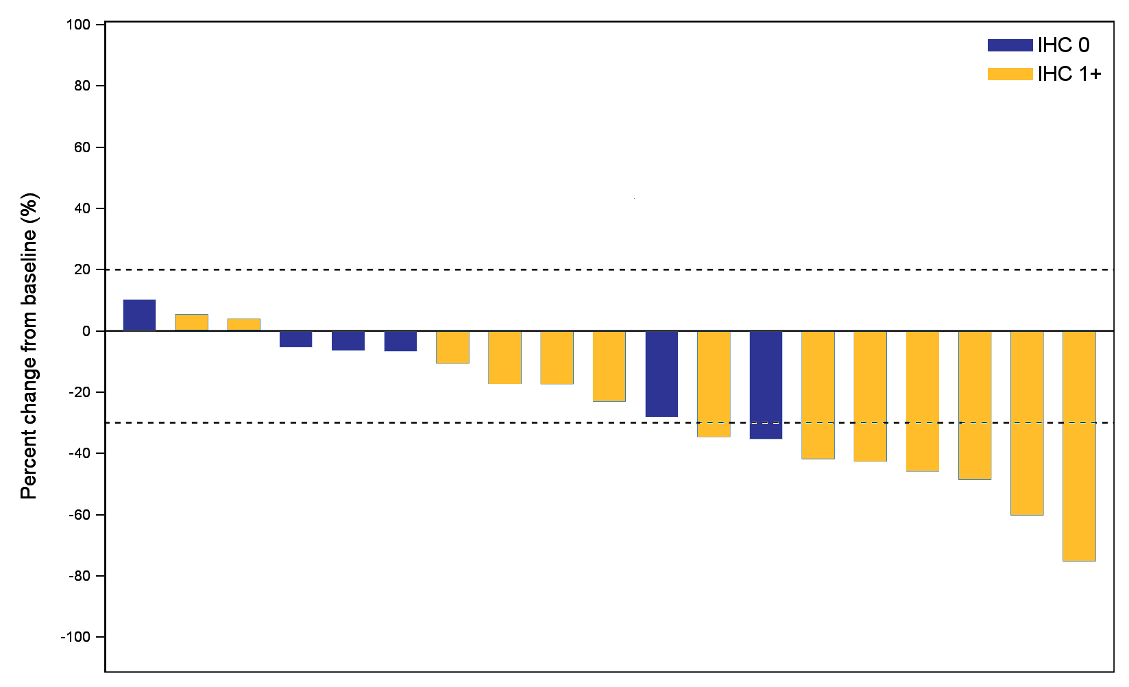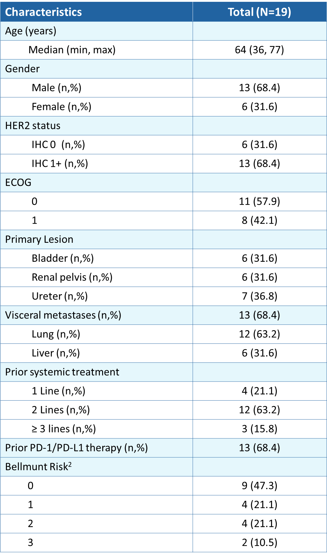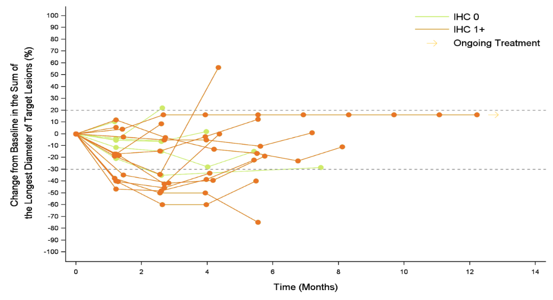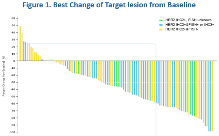 截止到2022年2月,研究入组了19例患者。中位年龄为64岁。其中6例患者HER2 IHC 0,13例患者HER2 IHC 1+。大多数患者(13/19)有内脏转移。15例(79%)患者接受了至少2线系统治疗。