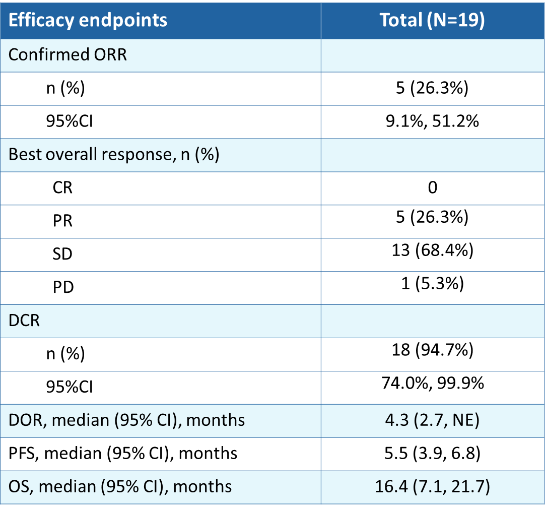 在截止日期进行统计,19例患者可评估疗效。客观缓解率为26.3% (95% CI:9.1%,51.2%), 疾病控制率为94.7%(18/19)。中位无进展生存期为5.5个月(95% CI:3.9,6.8),中位生存期为16.4个月(95% CI:7.1,21.7)。6例HER2 IHC 0患者的最佳疗效均为疾病稳定(SD)。HER2 IHC 1+患者的客观缓解率为38%(5/13),内脏转移患者的为31%(4/13),肝转移患者的为17%(1/6),≥2线系统治疗患者的为27%(4/15)。