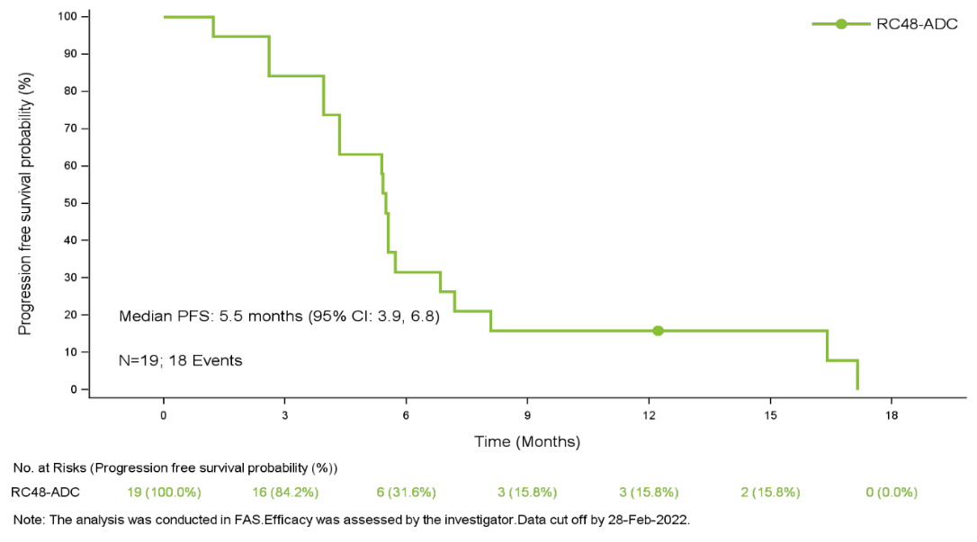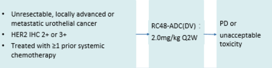 本研究是一项开放、单中心、单臂的II期临床试验。主要的入选标准包括:组织学证实的晚期尿路上皮癌,HER2阴性(IHC 0或1+),ECOG PS 0-1,既往接受过至少1次系统性治疗。患者接受RC48-ADC 2mg/kg 每2周一次治疗,直到疾病进展、不可接受的毒性、撤回同意书或研究终止。主要试验目的是观察抗肿瘤的有效性及安全性。主要研究终点是客观缓解率,次要研究终点包括无进展生存期、疾病控制率及总生存。