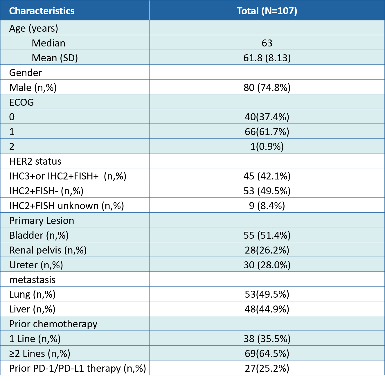 自2017年11月至2020年9月,RC48-C005和RC48-C009共入组 107名HER2过表达(IHC2+或3+)LA/mUC患者, 其中包括80名男性,中位年龄63岁[40-79]。