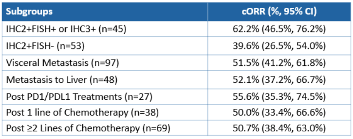 经IRC评估的cORR为50.5%。BOR为CR 1例,PR 53例,SD 34例。DCR为82.2%。在预先设定的亚组中观察到相似的疗效应答。肝转移患者的cORR为52.1%(25/48),而既往PD-1/L1治疗患者的cORR为55.6%(15/27)。HER2 IHC2+且FISH+或IHC3+患者的cORR为62.2%(28/45),HER2 IHC2+且FISH未知患者的cORR为55.6%(5/9),HER2 IHC2+且FISH-患者的cORR为39.6%(21/53)。