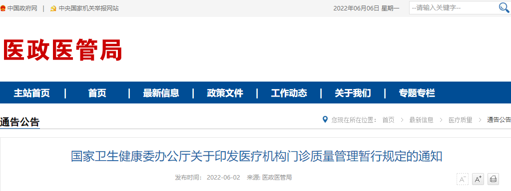 2022年6月6日,国家卫生健康委发布了《医疗机构门诊质量管理暂行规定》(国卫办医发〔2022〕8号)(以下简称《规定》)。