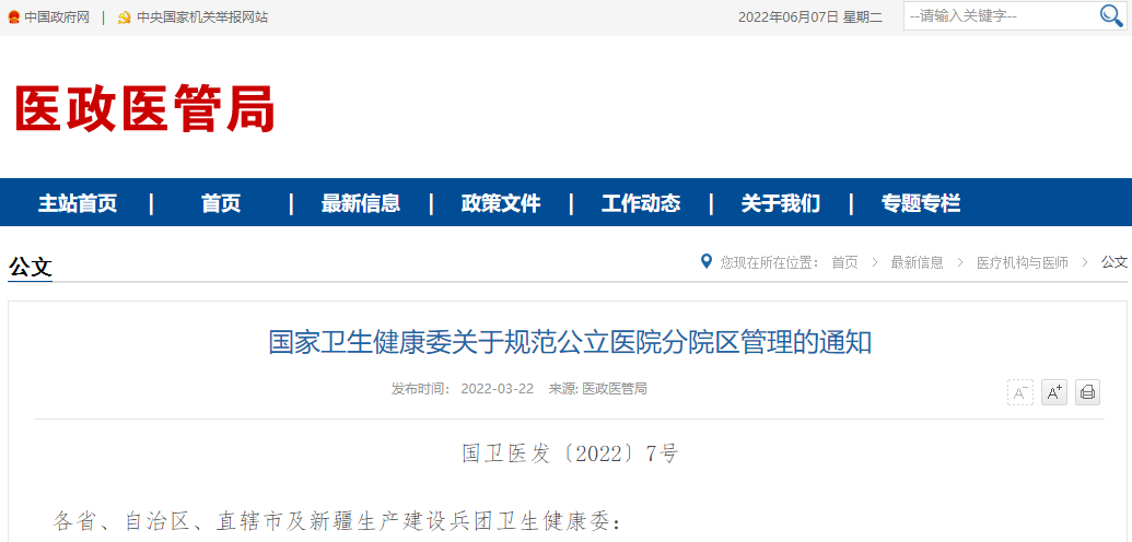 2022年6月7日,国家卫生健康委官网正式发布《关于规范公立医院分院区管理的通知》(国卫医发〔2022〕7号,以下简称《通知》),规范引导「实力强」的公立医院发展分院区。该通知是于2022年2月24日印发的。