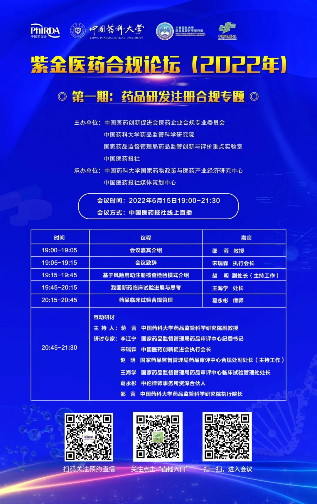 成熟的法规制度和合规体系是中国医药行业融入全球化竞争的必然要求。中国医药创新促进会(简称中国药促会)医药企业合规专委会联合中国药科大学药品监管科学研究院、中国医药报社共同主办“紫金医药合规论坛”系列论坛活动,首期为药品研发注册合规专题,将于2022年6月15日(周三)正式开播,特别邀请国家药监局药品审评中心有关领导、行业资深律师分享报告,并开展在线专家研讨。聚焦合规热点问题,加强合规管理的宣传力度与合规建设的重视程度,以促进行业健康发展。