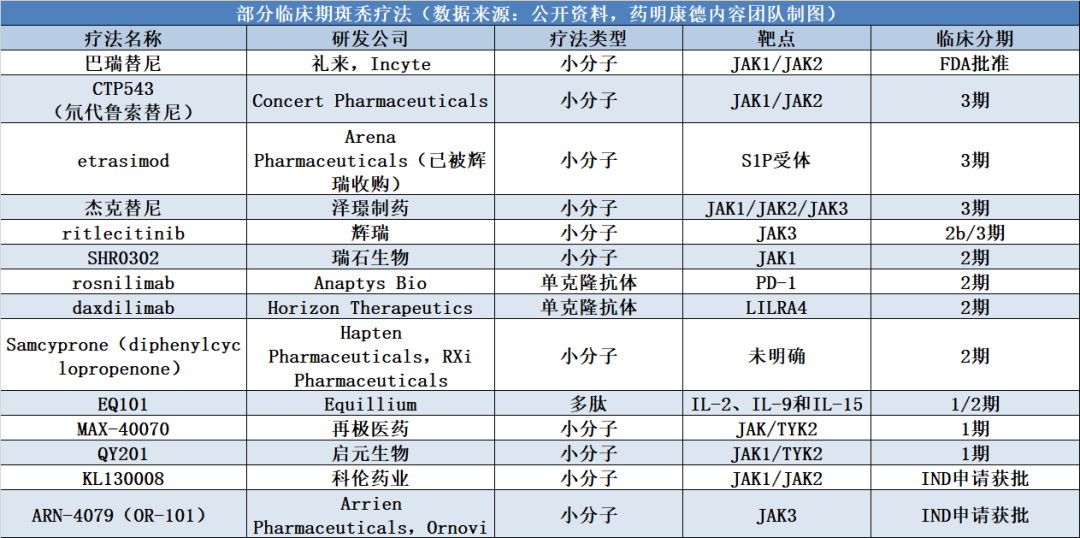 除了巴瑞替尼,辉瑞(Pfizer)公司的JAK3/TEC抑制剂ritlecitinib,Concert Pharmaceuticals公司的JAK1/2抑制剂CTP-543,泽璟制药的JAK抑制剂杰克替尼,和瑞石生物的JAK1抑制剂SHR0302也都已经在临床试验中获得积极结果,并且处于后期临床开发阶段。期待这些JAK抑制剂在临床试验中进展顺利,早日为斑秃患者带来更多治疗选择。