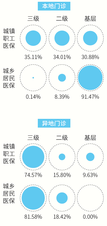 图1 江苏省某市参保人本地与异地门诊就医时对不同等级医疗机构的选择情况