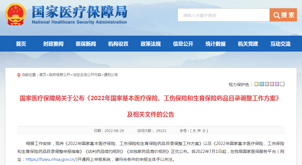 6月29日,《2022年国家基本医疗保险、工伤保险和生育保险药品目录调整工作方案》及相关文件正式公布,标志着自国家医保局成立以来的第五轮国家医保药品目录调整工作正式启动。