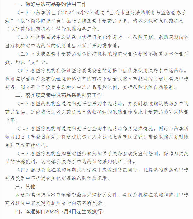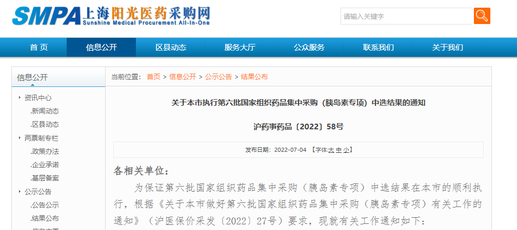 7 月 4 日,上上海医药阳光采购网发布《关于本市执行第六批国家组织药品集中采购(胰岛素专项)中选结果的通知》,宣布上海自7月4日起执行第六批国家集采(胰岛素专项)中选结果。到今天为止,第六批国采全国31省份已全部宣布执行。