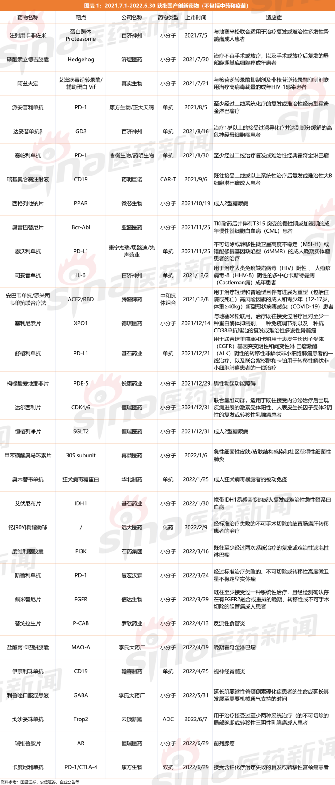 综合数据显示,2021年7月1日-2022年6月30日国内企业首次获批的创新药物(不包括已上市药物新获批适应症)在31个左右,创新靶点涉及PD-(L)1、PPAR、CD4/6等热门靶点,同时包括单抗、双抗、CAR-T多种药物类型,覆盖肿瘤、免疫、新冠治疗等多个疾病领域。