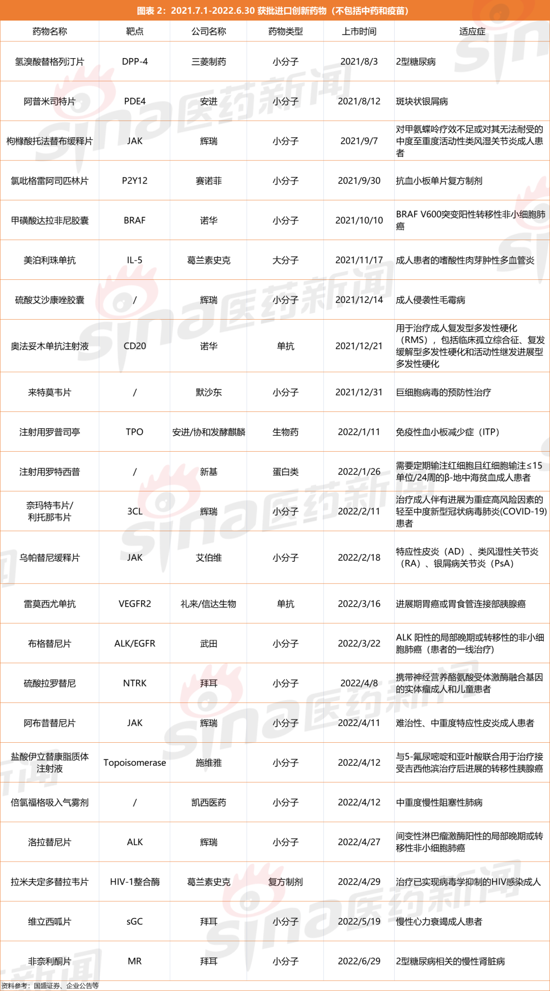 2022年6月30日是入门本次医保谈判的重要时间节点,据不完全统计,近一年以来共有50余款创新药获批上市(不包含中药和疫苗),其中国产新药超30款,进口药有20余款。