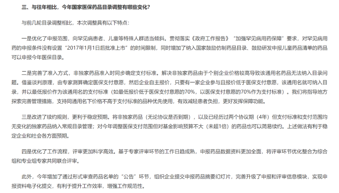 可以看到,医药创新依然是主旋律。而今年医保目录调整,申报条件向罕见病患者、儿童等特殊人群适当倾斜;还完善了准入方式,非独家药品准入时同步确定支付标准;改进了续约规则,更利于稳定预期。