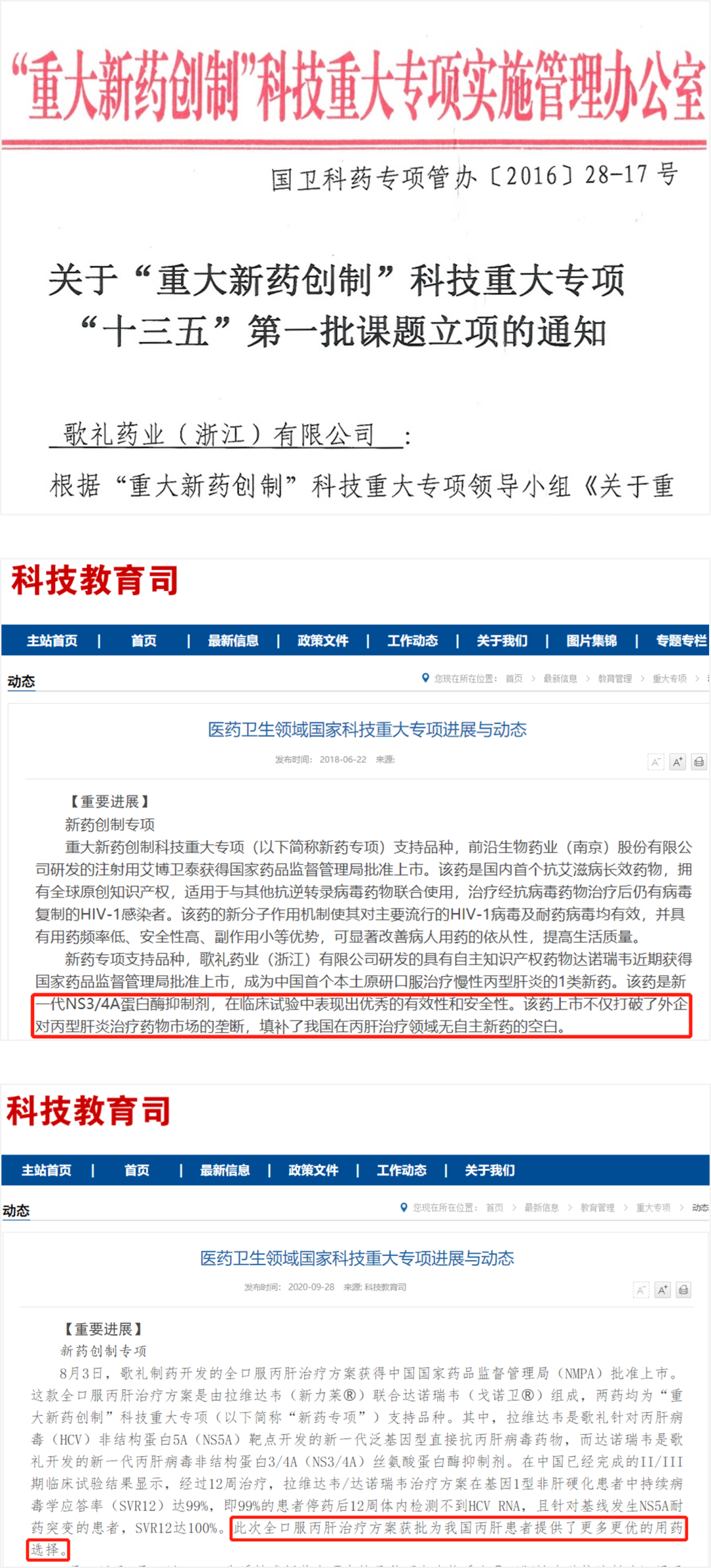 歌礼是国家“十三五”重大新药创制科技重大专项丙肝课题的牵头单位,共承担国家3项十三五国家重大新药创制科技专项丙肝课题。国家“重大新药创制”科技专项技术副总师陈凯先院士表示:“抗丙肝病毒药物——戈诺卫®是‘重大新药创制’科技专项在‘十三五’期间培育的首枚硕果,丙肝课题是‘十三五’重大专项的实施典范。”
