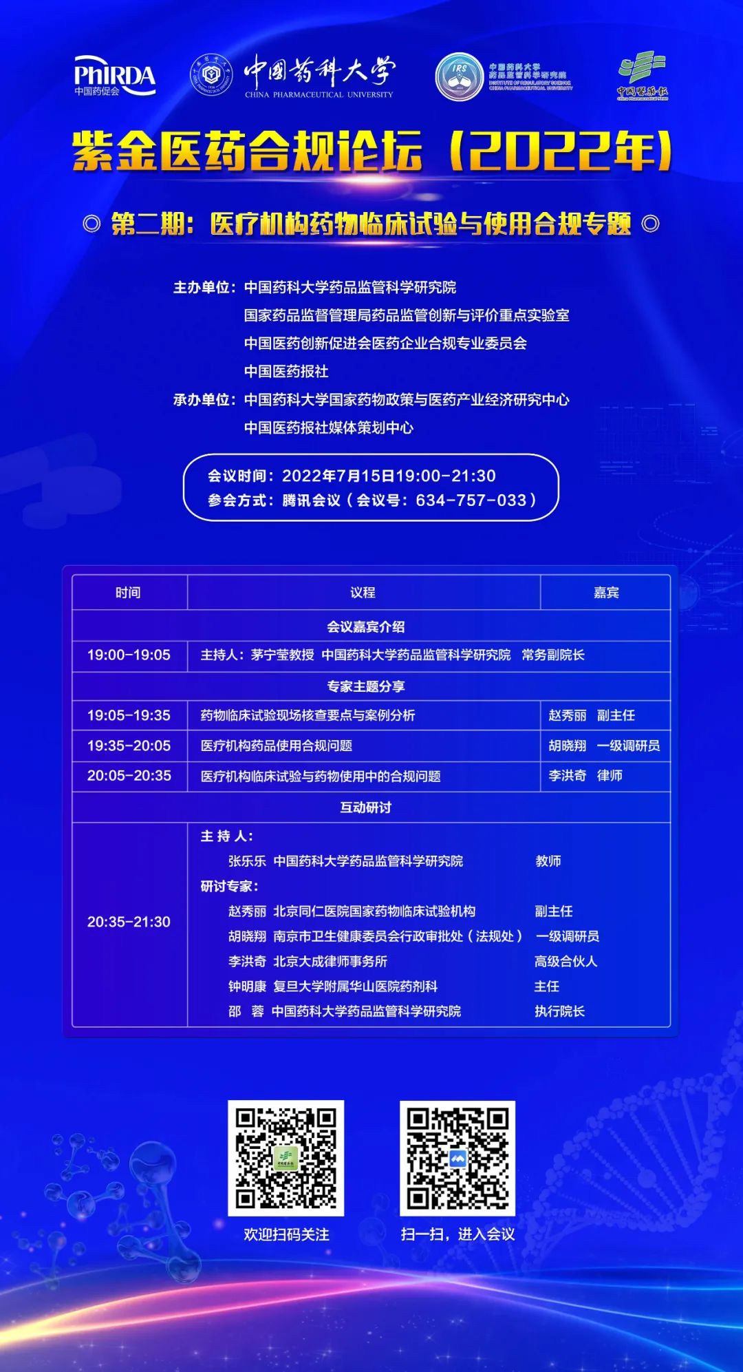 中国医药创新促进会(简称中国药促会)医药企业合规专委会联合中国药科大学药品监管科学研究院、中国医药报社共同主办“紫金医药合规论坛”系列论坛活动,第二期为医疗机构药物临床试验与使用合规专题,将于2022年7月15日(本周五)19:00在腾讯会议召开,会议邀请行业知名法学专家、教授、资深律师共同围绕药物临床试验核查及在医疗机构使用中的合规问题,分享经验与成果并在线交流研讨。欢迎大家如期观看,参与讨论!