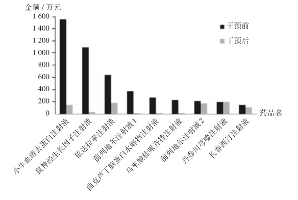 案例一:来自陕西省人民医院的李黎等“DRGs付费模式下临床药师参与神经内科药品成本管控效果分析”一文,提出在神经内科进行药师干预的情况下,3个DRGs分组药品费用均明显下降。尤其对于费用高、疗效不显著的辅助用药,建议减少使用。譬如神经保护剂由于其循证学证据不足,临床研究结论不一致,疗效尚待进一步证实,仅作为神经内科的辅助用药,是临床药师着重进行处方点评和医嘱重整的产品。下图是神经保护剂干预前后的使用情况。