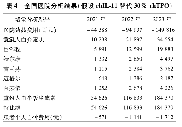 提出如果重组人白介素-l1替代重组人血小板生成素30%的市场份额,那么2021-2023年全国医院用于治疗血小板减少症的药品费用将节约44388万元、94937万元和149816万元。