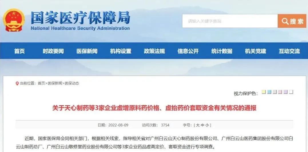 近期,国家医保局会同相关部门,根据相关线索,指导相关省对广州白云山天心制药股份有限公司、广州白云山医药集团股份有限公司白云山制药总厂、广州白云山敬修堂药业股份有限公司等3家企业药品虚高定价、套取资金进行专项调查。