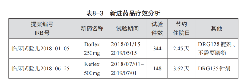 通过这样的分析可以看出儿科引进两种新药,即Doflflex和Keflflex,都有缩短住院日的疗效。仔细分析后发现,引进第一种药品,患者可提前2.45天出院,医疗质量保持不变。用临床路径及全成本核算精算后得出,全疗程可节约人民币362元,而新药全疗程约增加人民币145元。